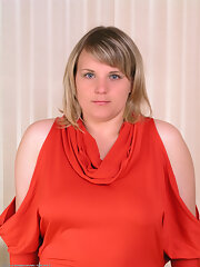 Chubby blonde mamture babe with hairy pussy takes off lingerie