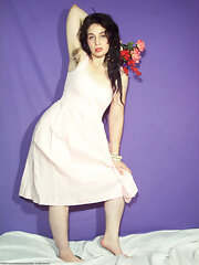 Delta Freya loves white and her short white dress is her favorite. Her dress, panties and stockings come off during her striptease. Then on her chair, spreading her legs we fully enjoy her hairy pussy.