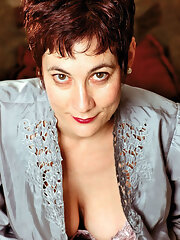 Shorthaired brunette older mom with big tits takes off black lingerie