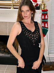 The fireplace is all ready to be lit, but Jennifer Tate is already hot. So she spreads her legs, takes off her panties and then her dress and plays with her hairy pussy.