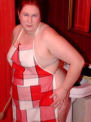 Sadie sits on the edge of the kitchen sink and washes her mature pink pussy