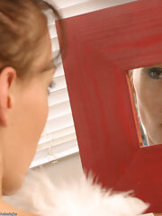 Beautiful longhaired brunette teen stripping in front of mirror